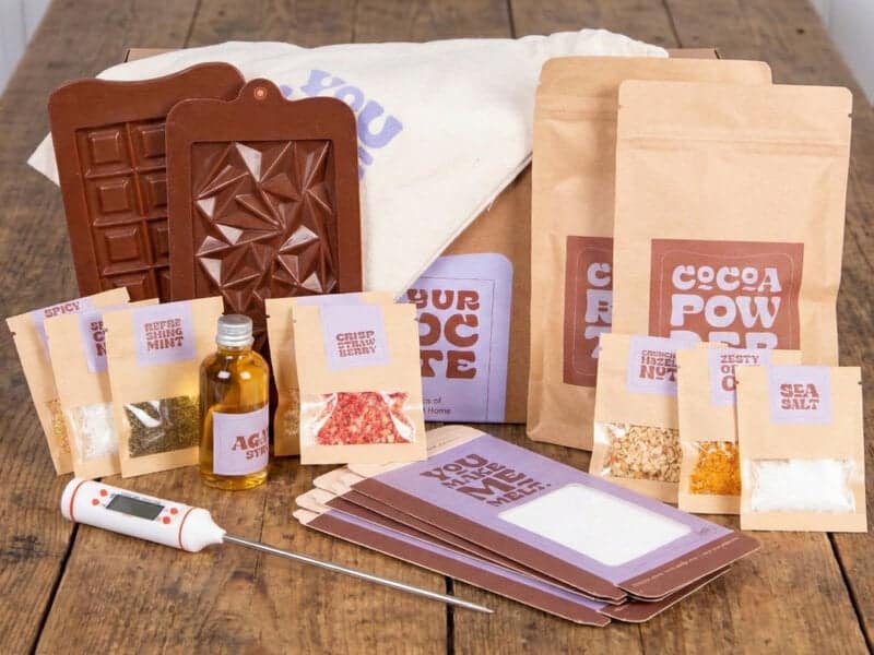 Skab din egen chokolade med et DIY Chokoladesæt, der inviterer til både kreativitet og nydelse. Dette er en kasse fyldt med alt, hvad du behøver for at lave personlige chokoladebarer, der smager lige så godt, som de er sjove at skabe. Perfekt som gave eller til hyggelige stunder derhjemme i køkkenet sammen med familien.